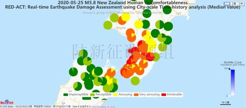 利用密布強(qiáng)震臺(tái)網(wǎng)在震后獲取的實(shí)時(shí)地震動(dòng)信息,再結(jié)合城市抗震彈塑性分析,就可以得到地震發(fā)生后不同地點(diǎn)的建筑破壞情況,為抗震救災(zāi)決策提供科學(xué)支撐。圖4為根據(jù)20200525新西蘭Levin5.8級(jí)地震震中附近范圍內(nèi)臺(tái)站記錄分析得到的建筑震害分布示意圖。圖5為根據(jù)20200525新西蘭Levin5.8級(jí)地震震中附近范圍內(nèi)臺(tái)站記錄分析得到的人員加速度感受分布示意圖。