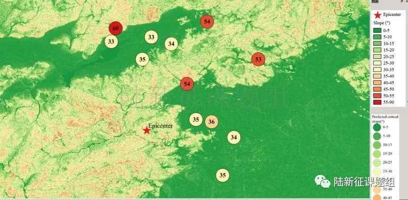 根據當地地形數據、巖性數據和實測地面運動記錄,可以計算得到不同滑坡體飽和比例下的滑坡分布,如圖5所示。其中,底圖為當地坡度分布圖,每個圓圈代表每個臺站的計算結果,圓圈中的數字代表發生滑坡的臨界坡度,臺站附近坡度大于該數值的地方滑坡發生概率高。
