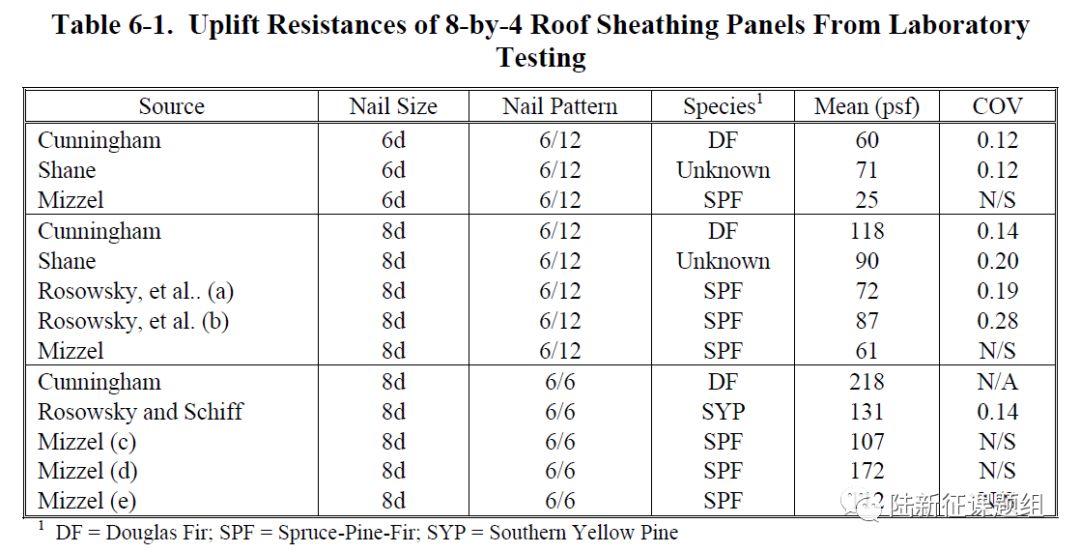 圖9 Hazus給出的部分屋面抗拔力試驗數(shù)據(jù)