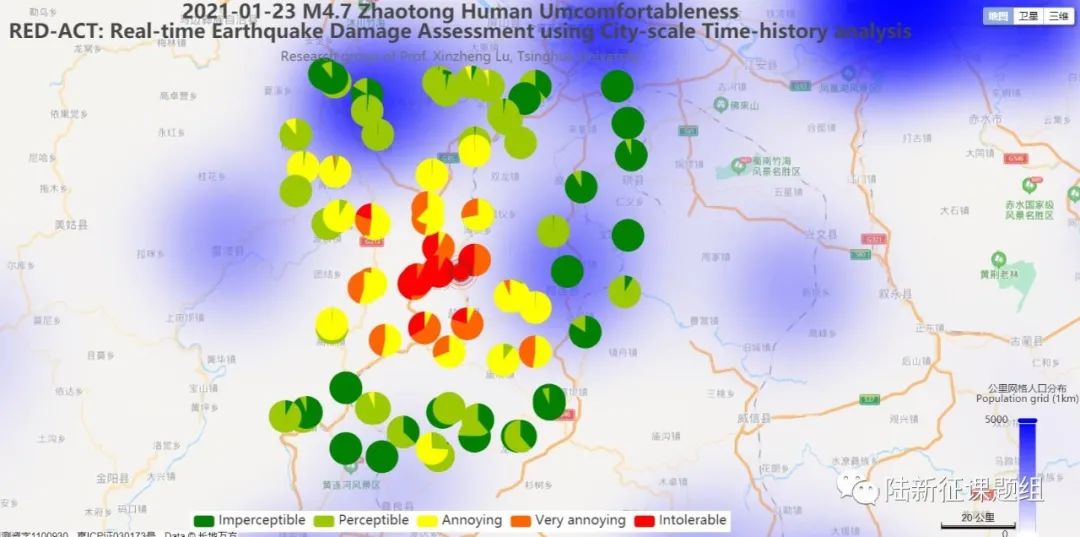 圖5 20210123云南昭通市鹽津縣4.7級(jí)地震不同臺(tái)站地震記錄人員加速度感受分布圖