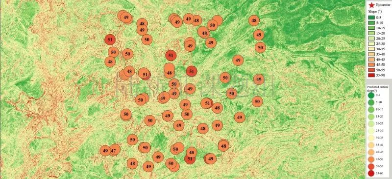 根據(jù)當(dāng)?shù)氐匦螖?shù)據(jù)、巖性數(shù)據(jù)和實(shí)測(cè)地面運(yùn)動(dòng)記錄,可以計(jì)算得到不同滑坡體飽和比例下的滑坡分布,如圖6所示。其中,底圖為當(dāng)?shù)仄露确植紙D,每個(gè)圓圈代表每個(gè)臺(tái)站的計(jì)算結(jié)果,圓圈中的數(shù)字代表發(fā)生滑坡的臨界坡度,臺(tái)站附近坡度大于該數(shù)值的地方滑坡發(fā)生概率高。