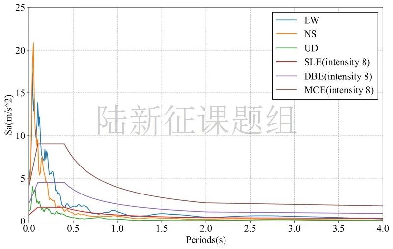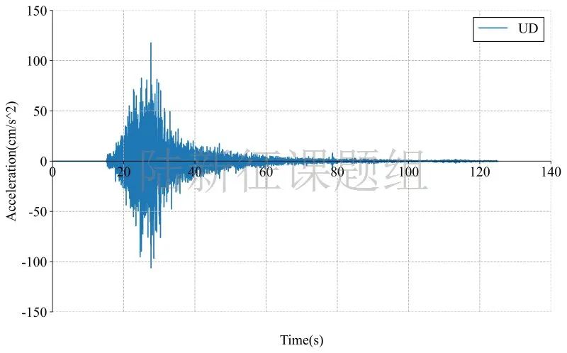 MYG011典型臺站位置北緯38.31度,東經141.50度(圖1,其中紅色標記為震中位置),記錄到水平向地震動峰值加速度為529.9cm/s/s,豎直向地震動峰值加速度為117.8cm/s/s。該地震動及反應譜如圖2、圖3所示。