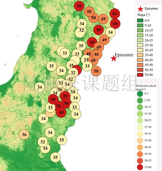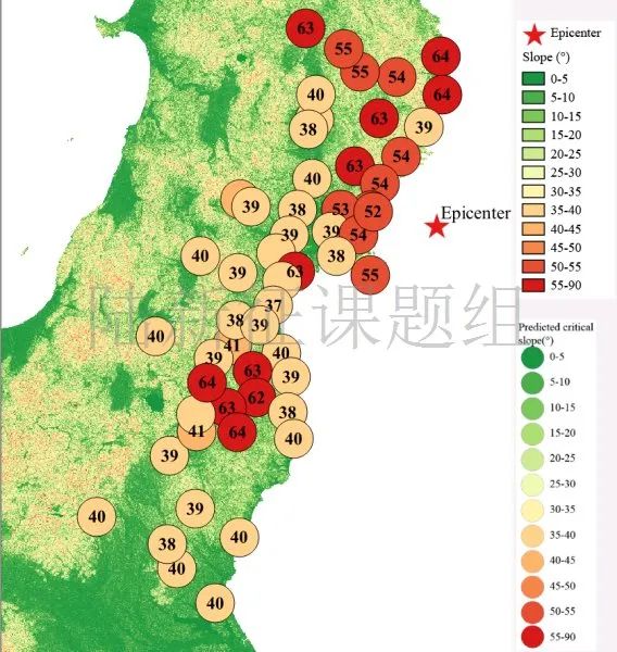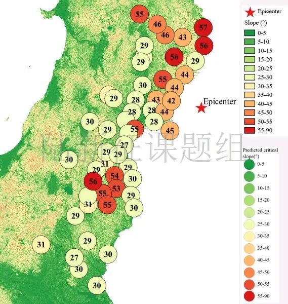 根據當地地形數據、巖性數據和實測地面運動記錄,可以計算得到不同滑坡體飽和比例下的滑坡分布,如圖6所示。其中,底圖為當地坡度分布圖,每個圓圈代表每個臺站的計算結果,圓圈中的數字代表發生滑坡的臨界坡度,臺站附近坡度大于該數值的地方滑坡發生概率高。