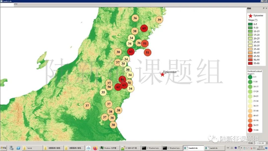 根據(jù)當(dāng)?shù)氐匦螖?shù)據(jù)、巖性數(shù)據(jù)和實(shí)測(cè)地面運(yùn)動(dòng)記錄,可以計(jì)算得到不同滑坡體飽和比例下的滑坡分布,如圖5所示。其中,底圖為當(dāng)?shù)仄露确植紙D,每個(gè)圓圈代表每個(gè)臺(tái)站的計(jì)算結(jié)果,圓圈中的數(shù)字代表發(fā)生滑坡的臨界坡度,臺(tái)站附近坡度大于該數(shù)值的地方滑坡發(fā)生概率高。