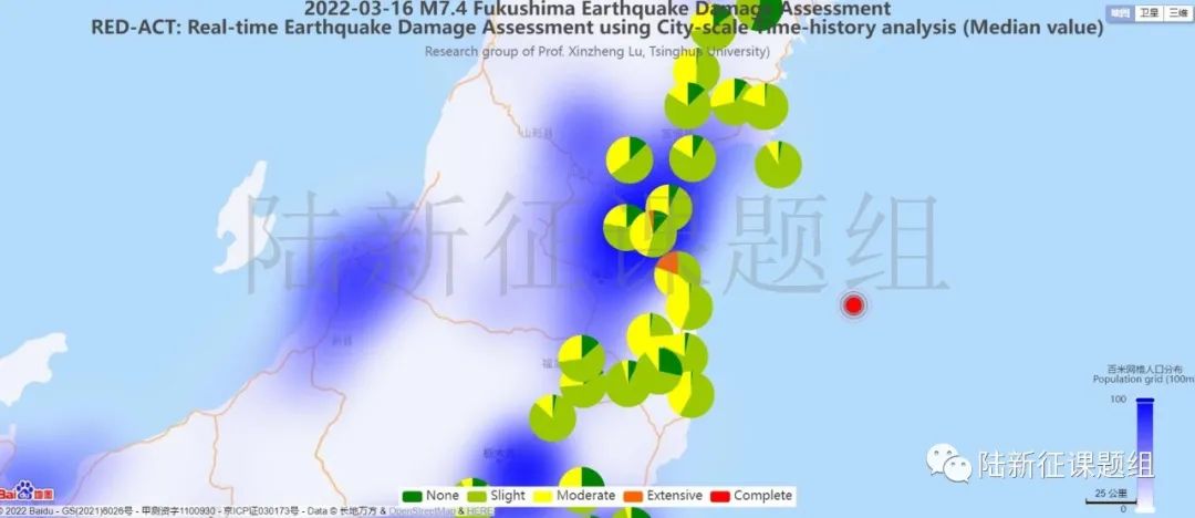根據(jù)中國地震學(xué)會(huì)標(biāo)準(zhǔn)《基于強(qiáng)震動(dòng)記錄的地震破壞力評(píng)估T/SSC 1—2021》(參閱新標(biāo)準(zhǔn)發(fā)布 :基于強(qiáng)震動(dòng)記錄的地震破壞力評(píng)估),利用密布強(qiáng)震臺(tái)網(wǎng)在震后獲取的實(shí)時(shí)地震動(dòng)信息,再結(jié)合城市抗震彈塑性分析,就可以得到地震發(fā)生后不同地點(diǎn)的建筑破壞情況,為抗震救災(zāi)決策提供科學(xué)支撐。圖3為根據(jù)20220316日本7.4級(jí)地震震中附近范圍內(nèi)臺(tái)站記錄分析得到的建筑震害分布示意圖。圖4為根據(jù)20220316日本7.4級(jí)地震震中附近范圍內(nèi)臺(tái)站記錄分析得到的人員加速度感受分布示意圖。