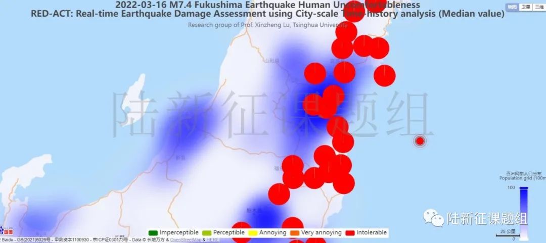 圖420220316日本7.4級(jí)地震不同臺(tái)站地震記錄人員加速度感受分布圖