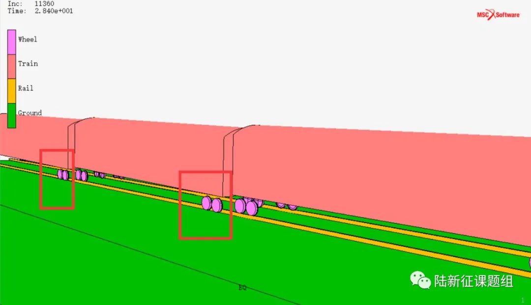 根據(jù)資料,列車并非在高速運(yùn)行時(shí)發(fā)生了脫軌,而是在“幾乎停止”的情況下發(fā)生了脫軌。因此本文為了簡(jiǎn)化起見(jiàn),計(jì)算列車在靜止?fàn)顟B(tài)下受地震作用的響應(yīng)。本文基于MSC.MARC通用有限元軟件,建立了一個(gè)簡(jiǎn)化的列車模型(圖2),在列車靜止?fàn)顟B(tài)開(kāi)始動(dòng)力工況模擬。