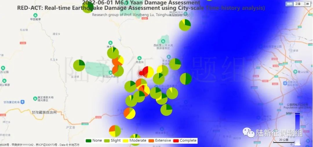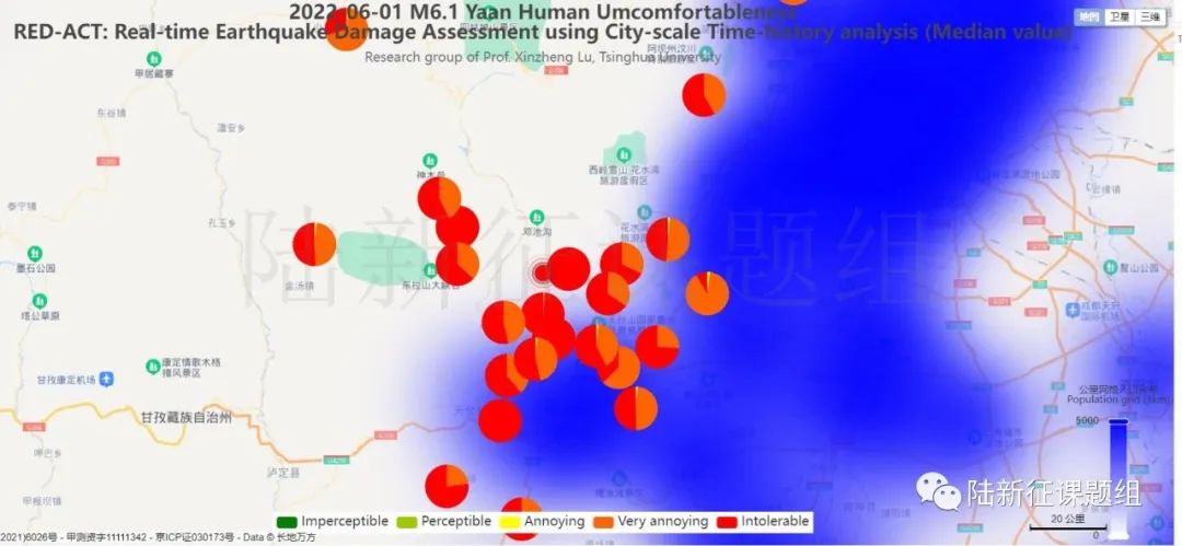 根據(jù)中國地震學(xué)會標(biāo)準(zhǔn)《基于強(qiáng)震動記錄的地震破壞力評估T/SSC 1—2021》(參閱新標(biāo)準(zhǔn)發(fā)布 :基于強(qiáng)震動記錄的地震破壞力評估),利用密布強(qiáng)震臺網(wǎng)在震后獲取的實時地震動信息,再結(jié)合城市抗震彈塑性分析,就可以得到地震發(fā)生后不同地點的建筑破壞情況,為抗震救災(zāi)決策提供科學(xué)支撐。圖3為根據(jù)本次地震震中附近范圍內(nèi)臺站記錄分析得到的建筑震害分布示意圖。圖4為根據(jù)本次地震震中附近范圍內(nèi)臺站記錄分析得到的人員加速度感受分布示意圖。