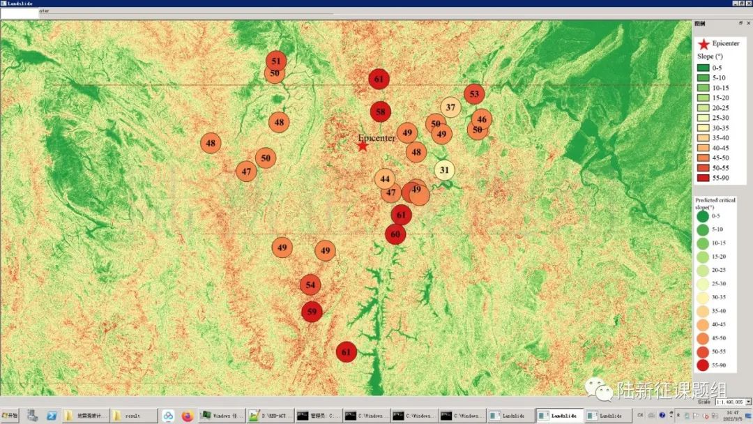 具體到這次瀘定6.8級(jí)地震,雖然考慮到近年來(lái)抗震防災(zāi)事業(yè)的進(jìn)步,我們?cè)谟?jì)算時(shí)已經(jīng)將建筑的抗震能力適當(dāng)提高(比均值增加了一倍標(biāo)準(zhǔn)差),但是RED-ACT仍然輸出了一串紅色(可能發(fā)生倒塌)的建筑震害模擬結(jié)果(圖3),滑坡的模擬結(jié)果也讓人很不安(圖4)。昨天看到這個(gè)結(jié)果心情就很沉重,今天看新聞,果然損失和傷亡確實(shí)很重。
