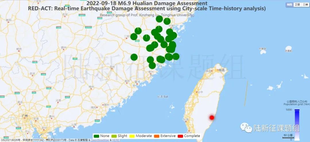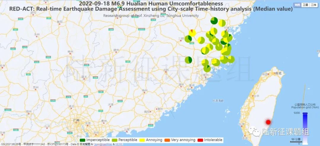 根據中國地震學會標準《基于強震動記錄的地震破壞力評估T/SSC 1—2021》(參閱新標準發布 :基于強震動記錄的地震破壞力評估),利用密布強震臺網在震后獲取的實時地震動信息,再結合城市抗震彈塑性分析,就可以得到地震發生后不同地點的建筑破壞情況,為抗震救災決策提供科學支撐。圖3為根據本次地震中國地震臺網中心臺站記錄分析得到的建筑震害分布示意圖。圖4為根據本次地震中國地震臺網中心臺站記錄分析得到的人員加速度感受分布示意圖。需要說明的是,由于臺灣島內詳細地震動數據未能獲得,所以無法進行分析。