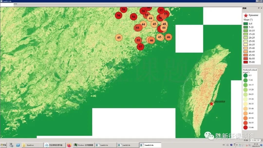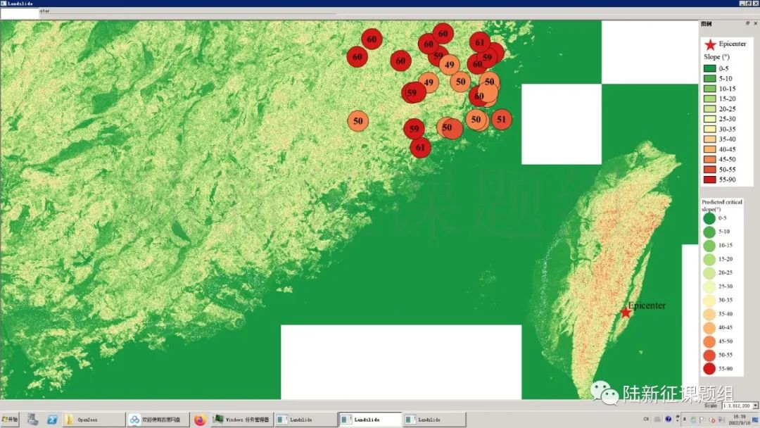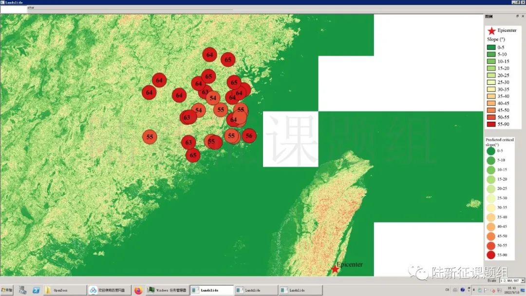 根據當地地形數據、巖性數據和實測地面運動記錄,可以計算得到不同滑坡體飽和比例下的滑坡分布,如圖5所示。其中,底圖為當地坡度分布圖,每個圓圈代表每個臺站的計算結果,圓圈中的數字代表發生滑坡的臨界坡度,臺站附近坡度大于該數值的地方滑坡發生概率高。