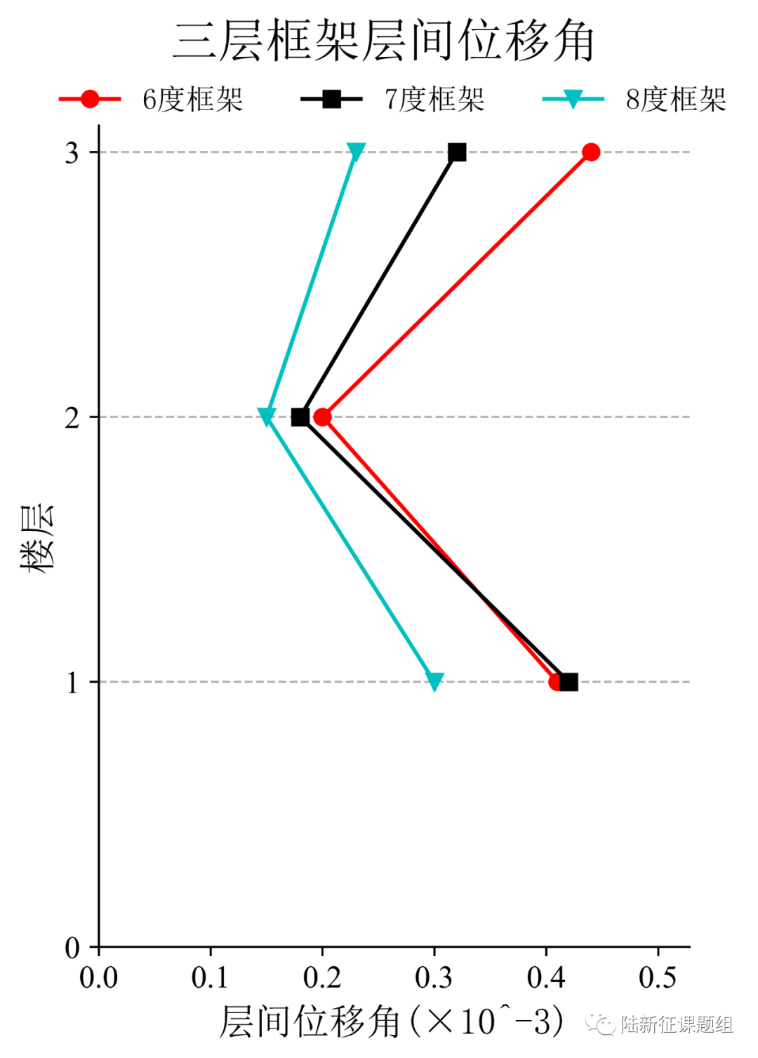 將FJ.H0011典型臺站記錄輸入立面布置如圖6(a)所示的6度、7度和8度設防的典型三層鋼筋混凝土框架結構,得到其層間位移角包絡如圖6(b)所示。