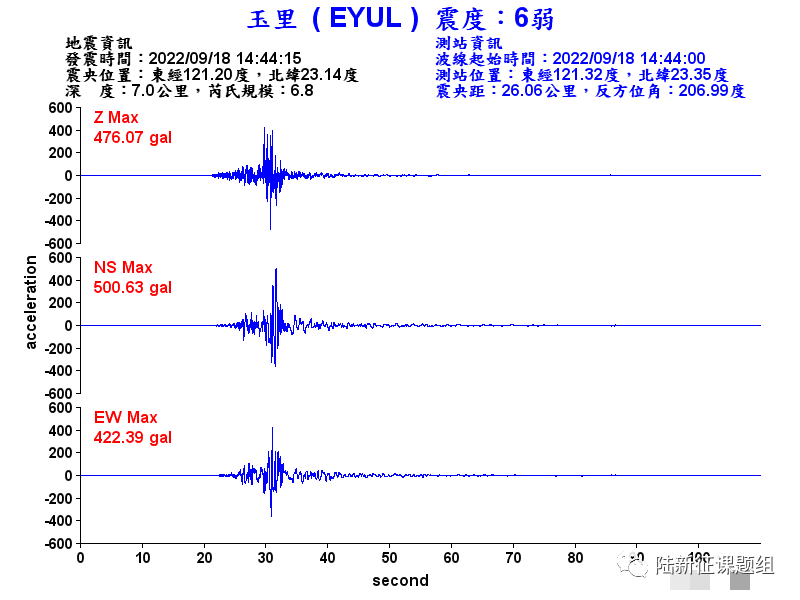此前我們給出了花蓮6.9級地震引起的福建等地區的破壞力分析結果,本報告進一步給出震中附近的分析結果。基于《Reconnaissance Report on Seismic Damage Caused by Guanshan Earthquake and Chihshang Earthquake (third edition, v3.0)》(以下簡稱《簡報》),選取最強的兩組地震動ECS和EYUL臺站記錄,如圖1和圖2所示。其中ECS臺站中長周期分量較強,而EYUL臺站短周期分量較強。