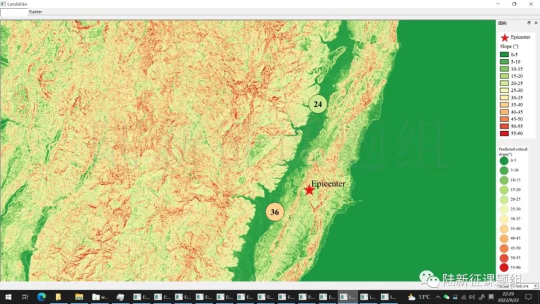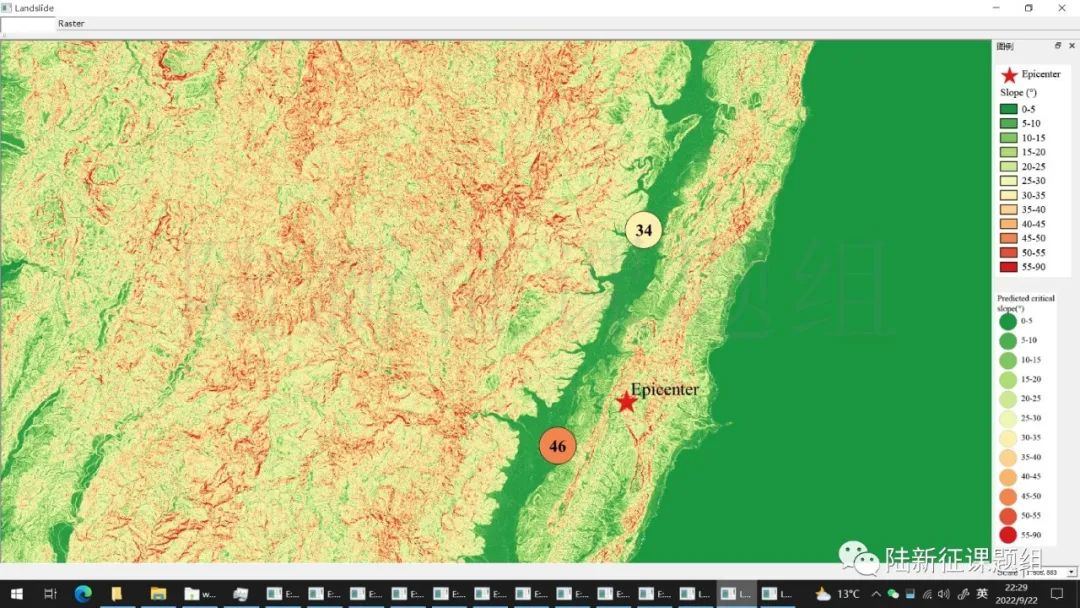 分析結果認為在震中附近30-40度以上坡度地區就可能發生滑坡,而震中附近地形又很復雜,因此滑坡的風險很高。這與本次花蓮地震實際震害情況相符。