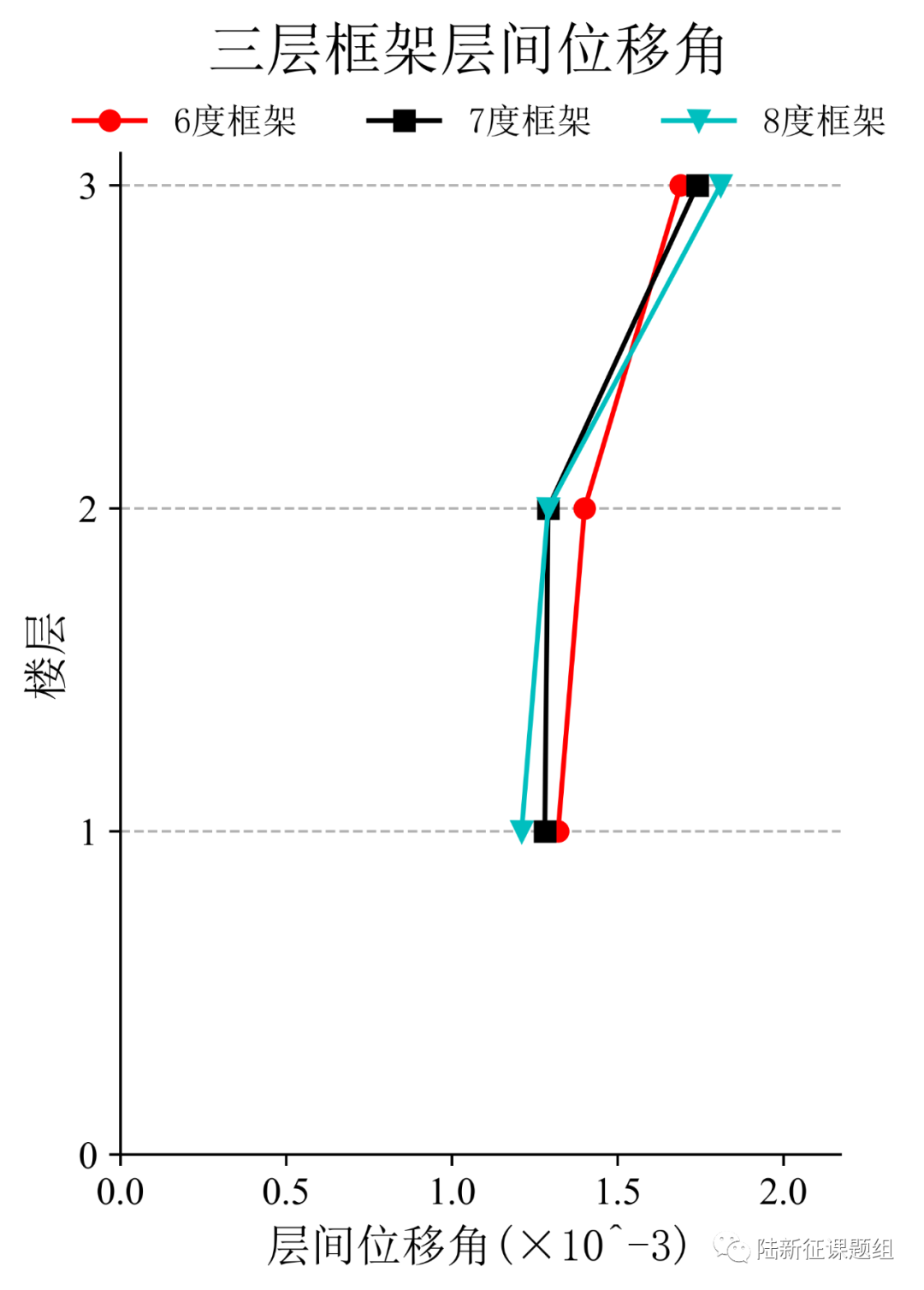 將典型臺站記錄輸入立面布置如圖6(a)所示的6度、7度和8度設防的典型三層鋼筋混凝土框架結構,得到其層間位移角包絡如圖6(b)所示。