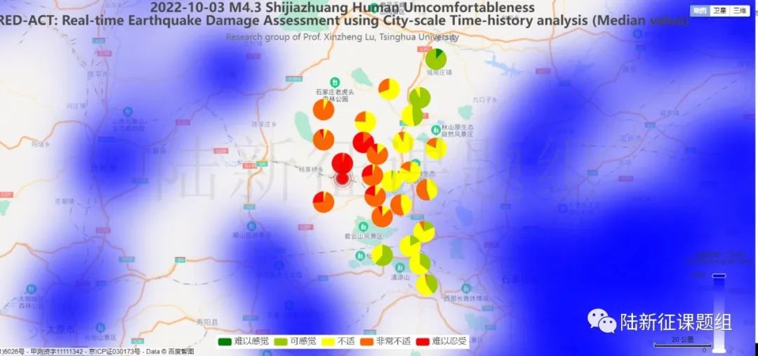 根據中國地震學會標準《基于強震動記錄的地震破壞力評估T/SSC 1—2021》(參閱新標準發布 :基于強震動記錄的地震破壞力評估),利用密布強震臺網在震后獲取的實時地震動信息,再結合城市抗震彈塑性分析,就可以得到地震發生后不同地點的建筑破壞情況,為抗震救災決策提供科學支撐。圖3為根據本次地震震中附近范圍內臺站記錄分析得到的建筑震害分布示意圖。圖4為根據本次地震震中附近范圍內臺站記錄分析得到的人員加速度感受分布示意圖。