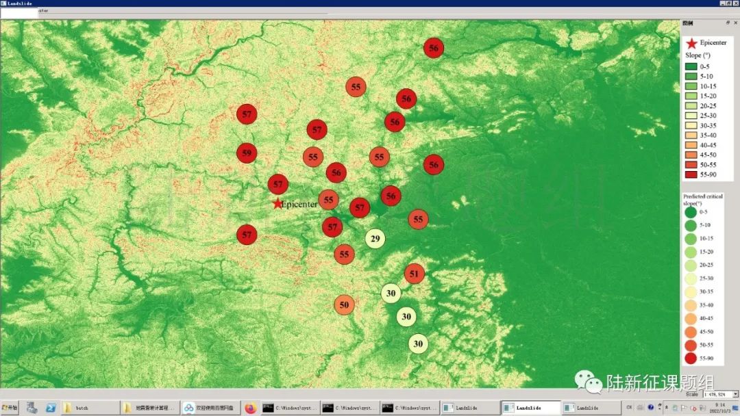 根據當地地形數據、巖性數據和實測地面運動記錄,可以計算得到不同滑坡體飽和比例下的滑坡分布,如圖5所示。其中,底圖為當地坡度分布圖,每個圓圈代表每個臺站的計算結果,圓圈中的數字代表發生滑坡的臨界坡度,臺站附近坡度大于該數值的地方滑坡發生概率高。