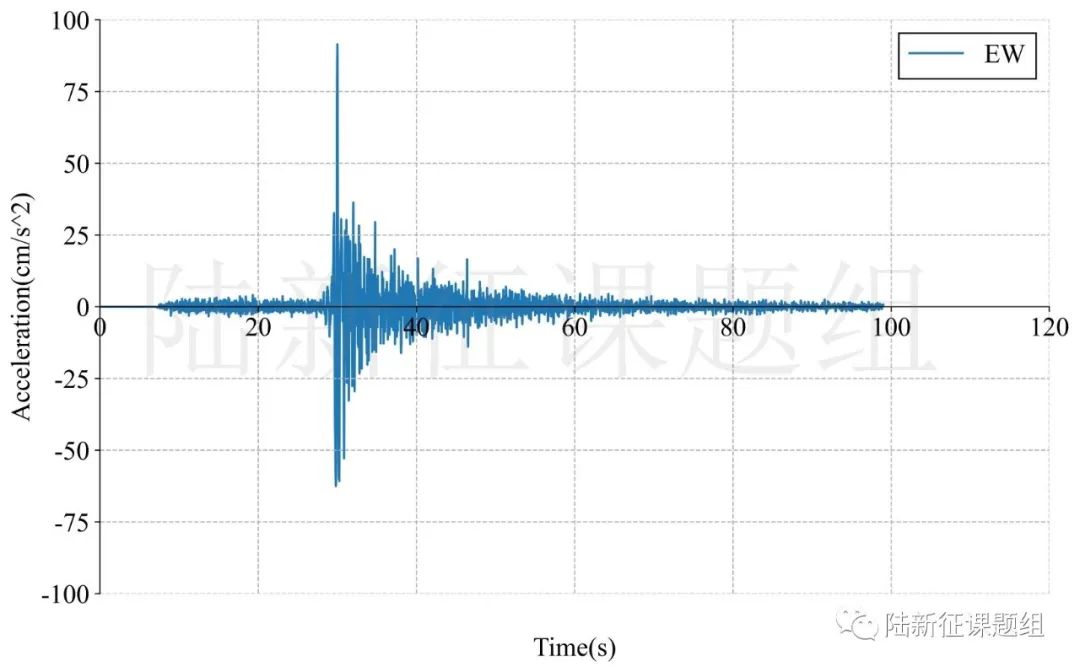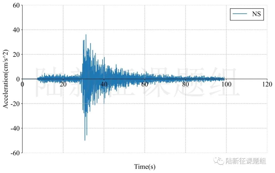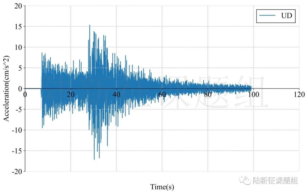 XJ.NK005典型臺站位置北緯41.17度,東經83.59度,記錄到水平向地震動峰值加速度為91.4cm/s/s,豎直向地震動峰值加速度為17.1cm/s/s。該地震動及反應譜如圖1、圖2所示。