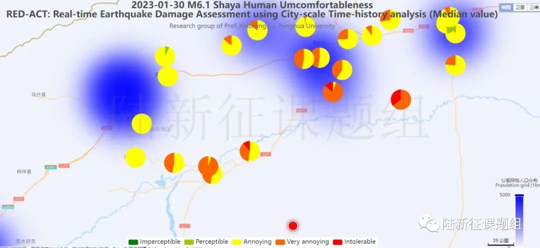 根據中國地震學會標準《基于強震動記錄的地震破壞力評估T/SSC 1—2021》(參閱新標準發布 :基于強震動記錄的地震破壞力評估),利用密布強震臺網在震后獲取的實時地震動信息,再結合城市抗震彈塑性分析,就可以得到地震發生后不同地點的建筑破壞情況,為抗震救災決策提供科學支撐。圖3為根據本次地震震中附近范圍內臺站記錄分析得到的建筑震害分布示意圖。圖4為根據本次地震震中附近范圍內臺站記錄分析得到的人員加速度感受分布示意圖。