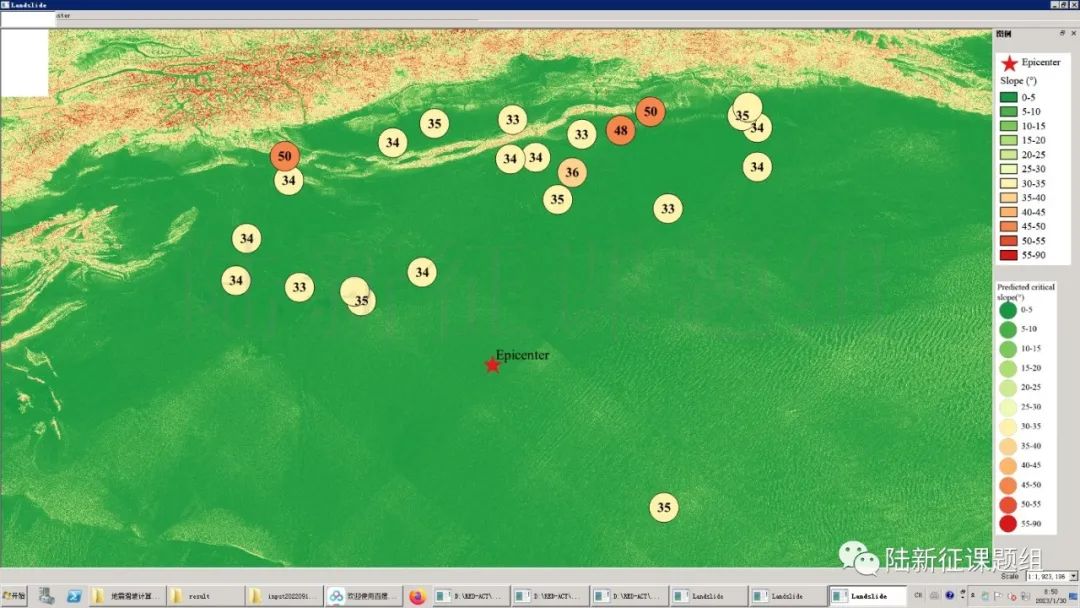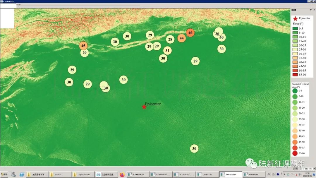 根據當地地形數據、巖性數據和實測地面運動記錄,可以計算得到不同滑坡體飽和比例下的滑坡分布,如圖5所示。其中,底圖為當地坡度分布圖,每個圓圈代表每個臺站的計算結果,圓圈中的數字代表發生滑坡的臨界坡度,臺站附近坡度大于該數值的地方滑坡發生概率高。
