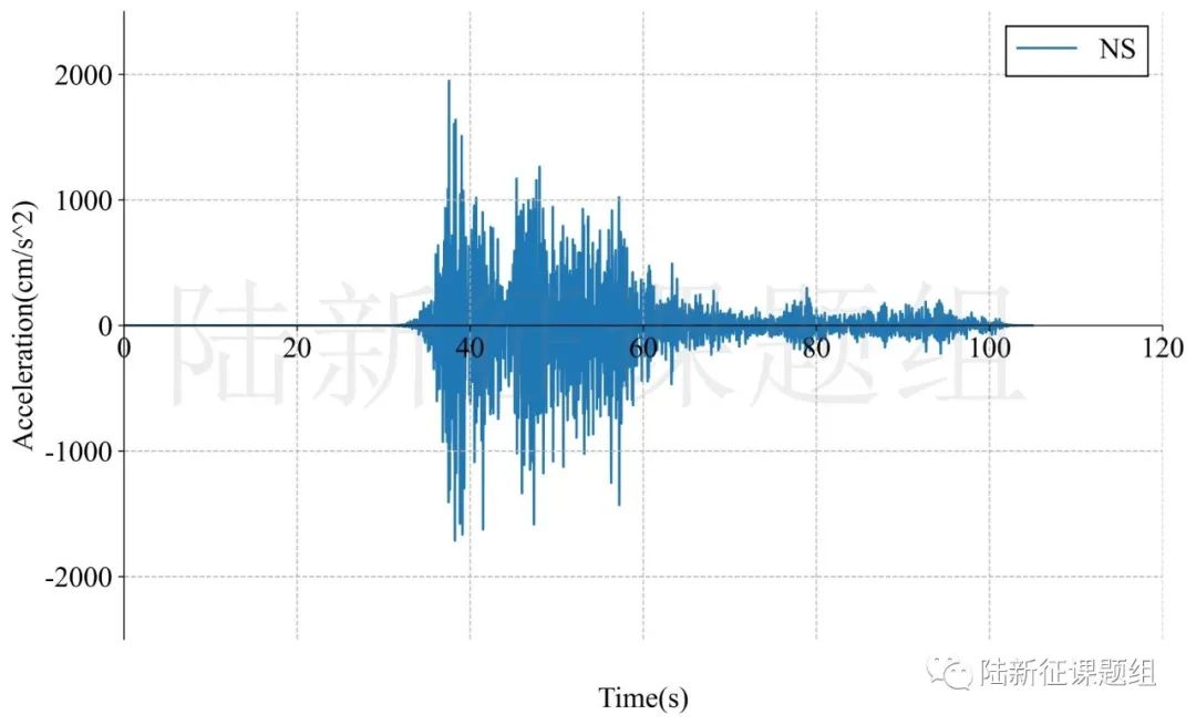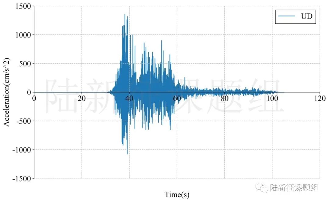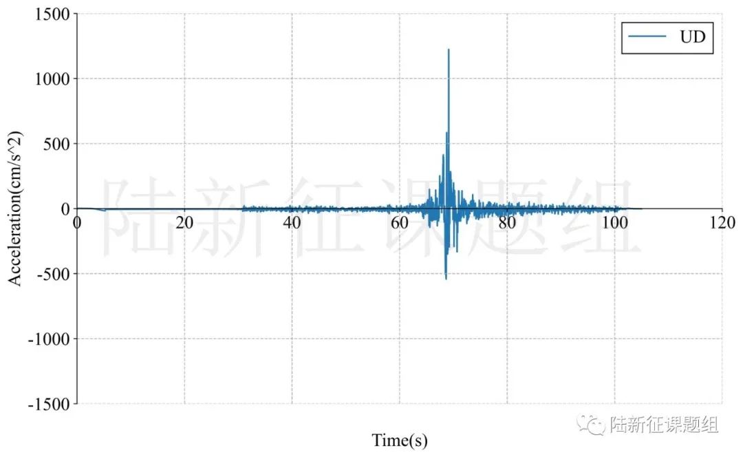 1:臺站4614位置北緯37.48513度,東經(jīng)37.29775度,記錄到水平向地震動峰值加速度為1966cm/s/s,豎直向地震動峰值加速度為1352cm/s/s。該地震動及反應譜如圖1、圖2所示。