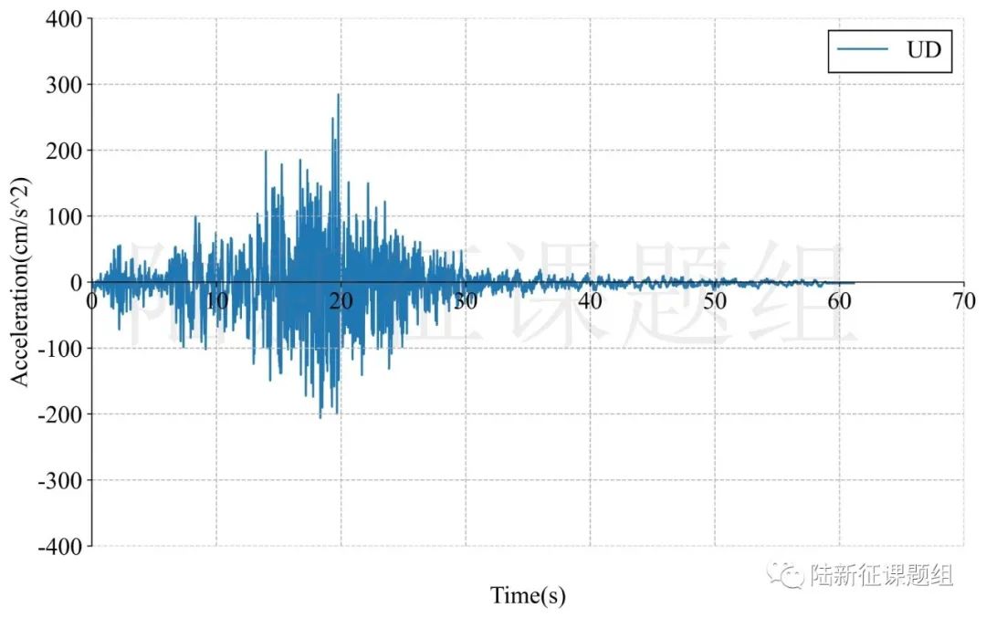 1:臺站4612位置北緯38.02395度,東經(jīng)36.48187度,記錄到水平向地震動峰值加速度為638cm/s/s,豎直向地震動峰值加速度為373cm/s/s。該地震動及反應譜如圖6、圖7所示。