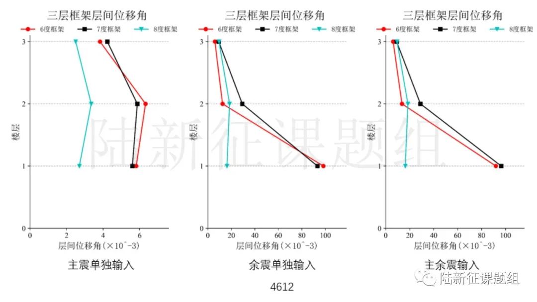 將典型臺站記錄輸入立面布置如圖14所示的6度、7度和8度設(shè)防的典型三層鋼筋混凝土框架結(jié)構(gòu),得到其層間位移角包絡(luò)如圖15所示。