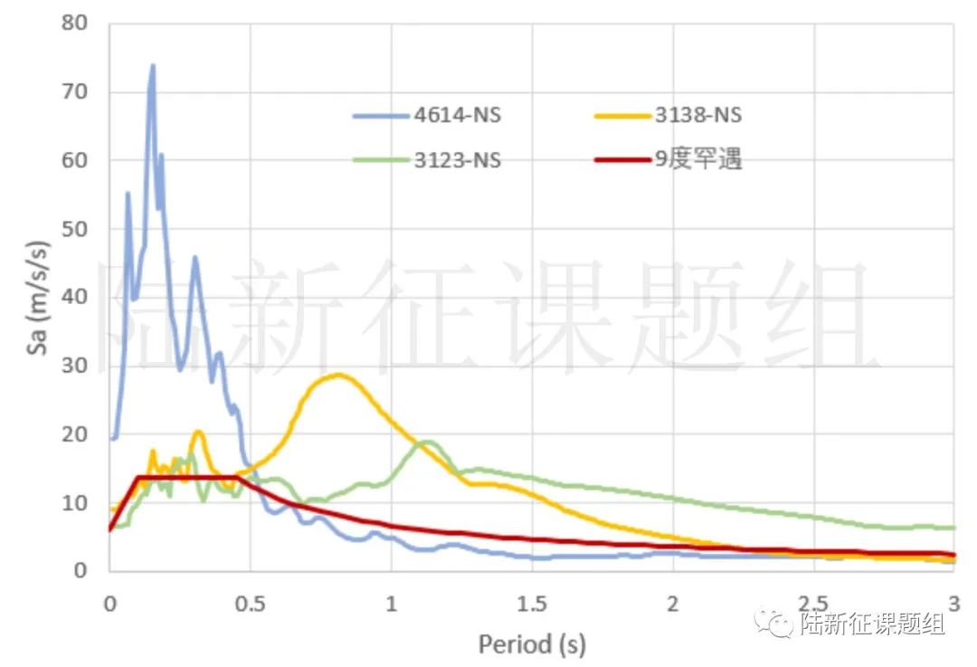 在3138臺站地震動輸入下,居然所有的分析案例都是”毀壞“,于是趕緊把這幾個地震動的反應譜繪制出來,如圖1所示。