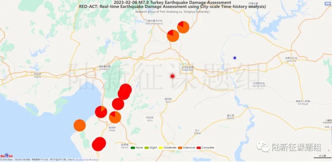 從圖4、5可見,在地圖南側的震害是非常嚴重的,大部分建筑都進入了倒塌或者嚴重破壞的狀態(tài)(紅色或橙色)。這里肯定有讀者會問:圖4只是一次7.8級地震引起的破壞,北側藍點(第二次7.8級地震震中)附近在第二次7.8級地震后肯定會遭到很嚴重的破壞啊!確實,第二次7.8級地震發(fā)生后,建筑震害肯定會進一步的變化。但是這種破壞肯定和直接遭受一次7.8級地震作用的結果不一樣。因為第一次地震已經(jīng)引起了破壞,第二次地震再來,建筑的破壞會進一步發(fā)展,而兩次地震疊加會使得問題更加復雜。那兩次地震疊加后的區(qū)域建筑震害該怎么分析呢?不急,我們有專門研究,請聽下回分解。今天我們只討論第一次7.8級地震的影響。