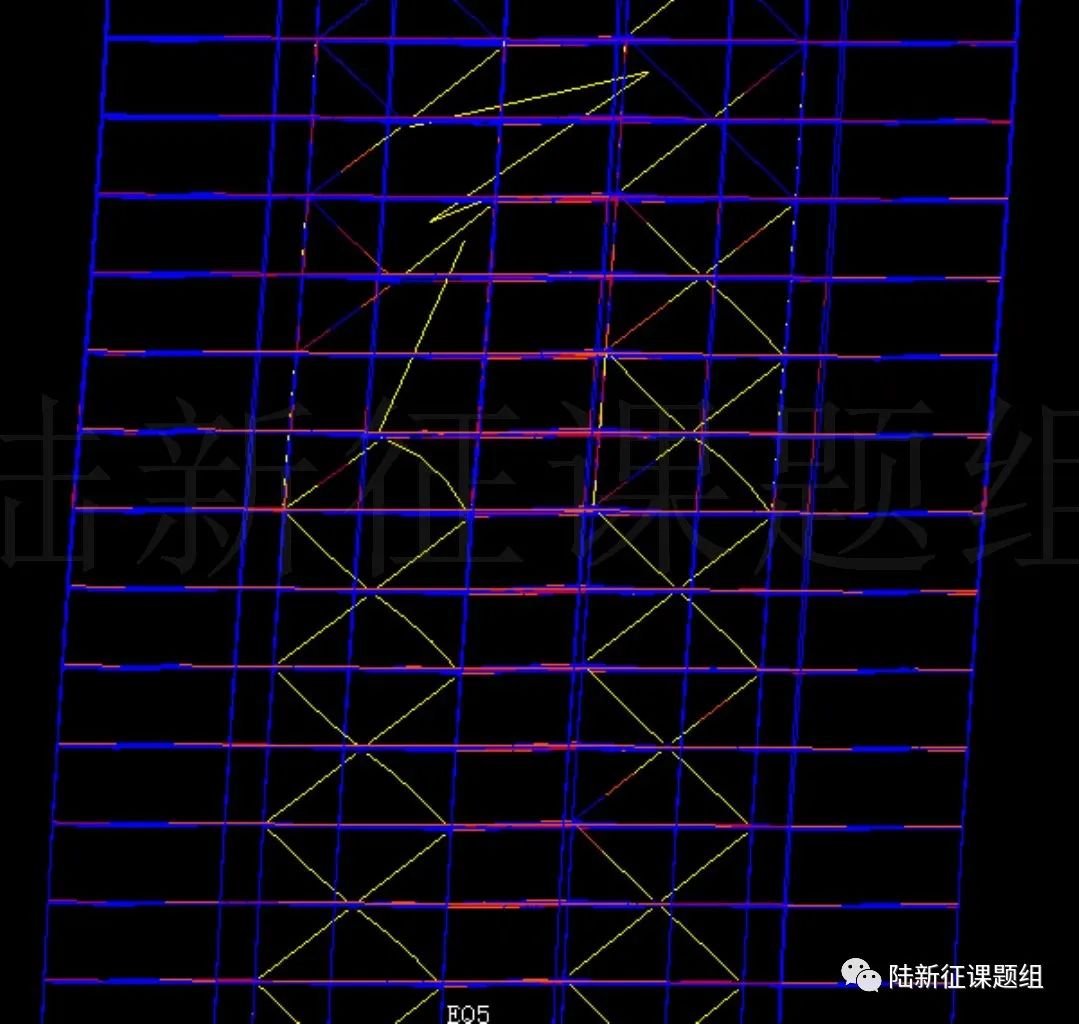 (2) 鋼框架-支撐結構中國建筑科學研究院設計了一棟高度166m、37層的鋼框架-支撐結構,首層層高12.9m,其余層4.2m,平面尺寸50.2mx48.6m,核心筒尺寸21.8mx20m。按8度、三類場地設計,用于中美抗震規(guī)范設計結果對比(圖8)。我們課題組張弛同學建立了其非線性有限元模型,結構一階周期約為5.9s。
