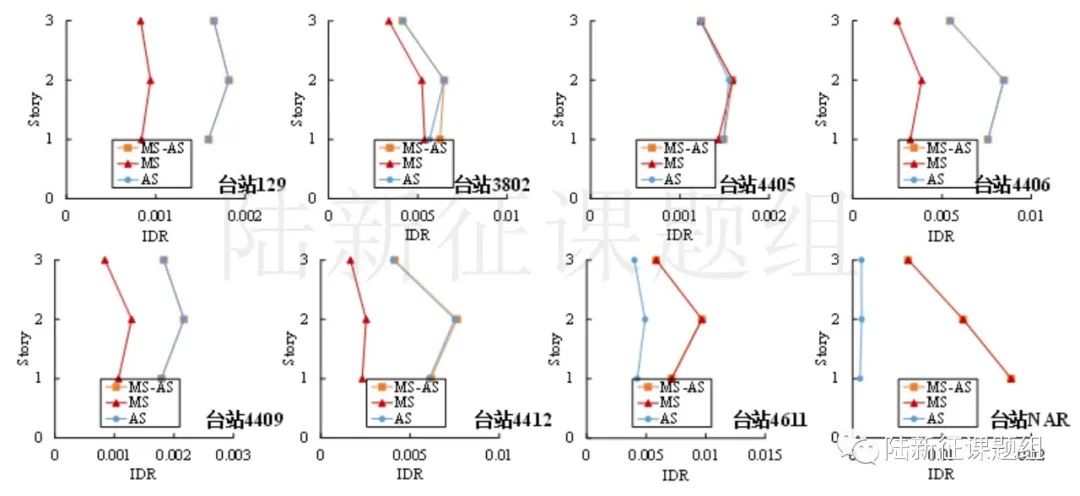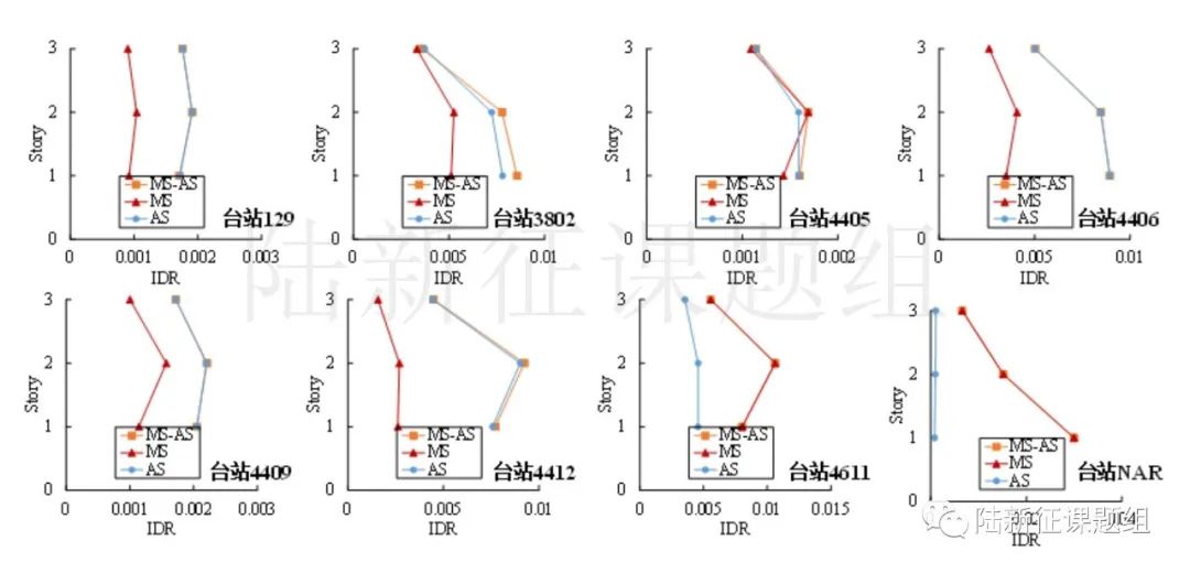 從圖3和圖4中可以看出,序列型地震作用下結(jié)構(gòu)的地震響應(yīng)更為復(fù)雜,例如,對于臺站3802而言,序列地震動作用下結(jié)構(gòu)響應(yīng)大于M7.8A和M7.8B分別作用下的響應(yīng),因為在一次7.8級地震的作用下,結(jié)構(gòu)已經(jīng)是受損狀態(tài),再來一個7.8級地震,結(jié)構(gòu)的損傷會進一步加大。這說明多次地震的作用會進一步增大結(jié)構(gòu)的響應(yīng),需要在結(jié)構(gòu)的分析中予以考慮,但是損傷增大的幅度很復(fù)雜,不是兩次損傷的簡單相加。需要通過科學(xué)的計算才能得到。這也進一步體現(xiàn)了采用時程分析的優(yōu)勢,即可以考慮序列型地震的作用。
