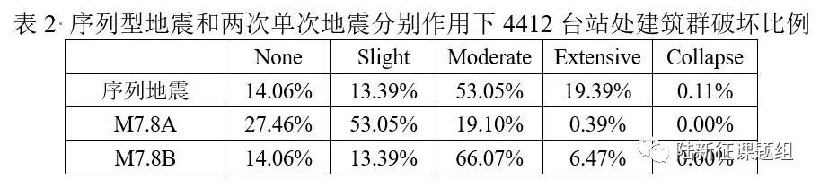 從圖中可以看出,序列型地震作用下區(qū)域建筑的震害情況更為復(fù)雜,對于某些臺站(如右上角的4412臺站),序列地震動作用下建筑破壞比例大于M7.8A和M7.8B兩次地震單獨作用下的破壞情況(表2),這說明序列型地震的發(fā)生會進一步增加建筑的破壞。但破壞程度同樣不是兩次地震的簡單相加,而城市抗震彈塑性分析方法是科學(xué)預(yù)測區(qū)域建筑在序列型地震作用下震害的有效方法。