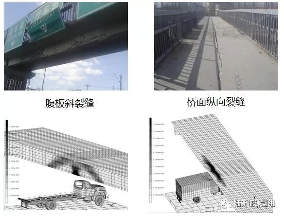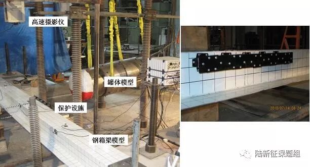我們首先在實驗室進行了超高車輛撞擊橋梁上部結構的模型試驗,制作了油罐車罐體模型,通過擺錘運動撞擊混凝土T梁、鋼箱梁、鋼板梁、FRP梁橋模型,獲得了撞擊作用下不同橋梁的破壞機理(圖6)。