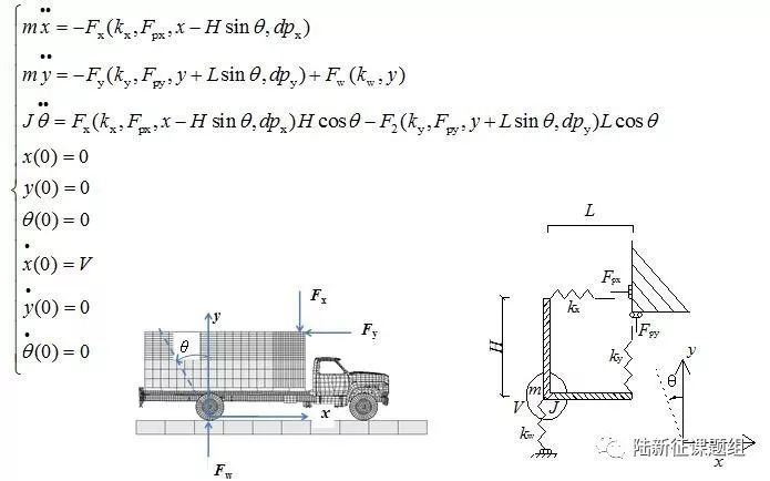 并發現,整體破壞模式主要和撞擊過程的沖量大小有關,局部破壞模式主要和撞擊過程中的最大撞擊力有關。于是,就要設法提出撞擊過程中總沖量和最大撞擊力的計算方法。為此,我們首先建立了超高車撞擊橋梁上部結構的理論模型。根據超高車撞擊橋梁過程中的運動學特征(圖10),通過大量參數討論論證可以進行如下簡化(1)忽略車廂-橋梁摩擦力;(2)忽略車輪-路面摩擦力;(3)忽略車輛重力;(4)橋梁簡化成剛性墻。得到相應的簡化模型和運動微分方程(圖11)。