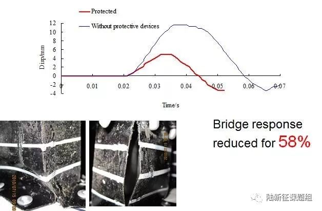 針對既有橋梁防護車輛撞擊的需要,我們還發明了一種高效輕質的耗能防護裝置并獲得了發明專利(圖18),并通過撞擊模型試驗驗證了該裝置的有效性(圖19)。