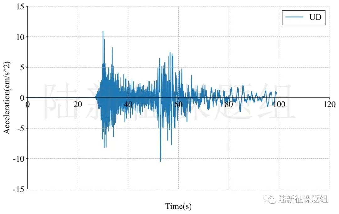 QT001.20典型臺站位置北緯37.78度,東經75.23度,記錄到水平向地震動峰值加速度為24cm/s/s,豎直向地震動峰值加速度為11cm/s/s。該地震動及反應譜如圖1、圖2所示。