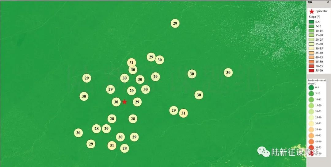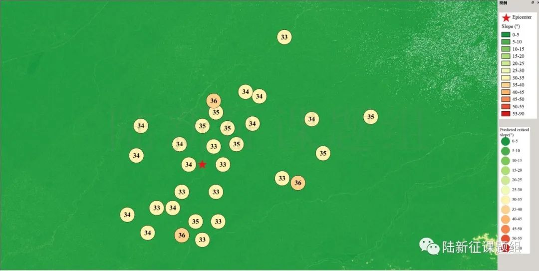 根據(jù)當?shù)氐匦螖?shù)據(jù)、巖性數(shù)據(jù)和實測地面運動記錄,可以計算得到不同滑坡體飽和比例下的滑坡分布,如圖5所示。其中,底圖為當?shù)仄露确植紙D,每個圓圈代表每個臺站的計算結(jié)果,圓圈中的數(shù)字代表發(fā)生滑坡的臨界坡度,臺站附近坡度大于該數(shù)值的地方滑坡發(fā)生概率高。