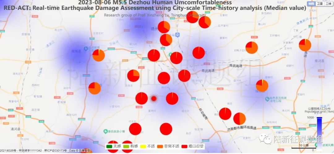 根據(jù)中國地震學會標準《基于強震動記錄的地震破壞力評估T/SSC 1—2021》(參閱新標準發(fā)布 :基于強震動記錄的地震破壞力評估),利用密布強震臺網(wǎng)在震后獲取的實時地震動信息,再結(jié)合城市抗震彈塑性分析,就可以得到地震發(fā)生后不同地點的建筑破壞情況,為抗震救災(zāi)決策提供科學支撐。圖3為根據(jù)本次地震震中附近范圍內(nèi)臺站記錄分析得到的建筑震害分布示意圖。圖4為根據(jù)本次地震震中附近范圍內(nèi)臺站記錄分析得到的人員加速度感受分布示意圖。